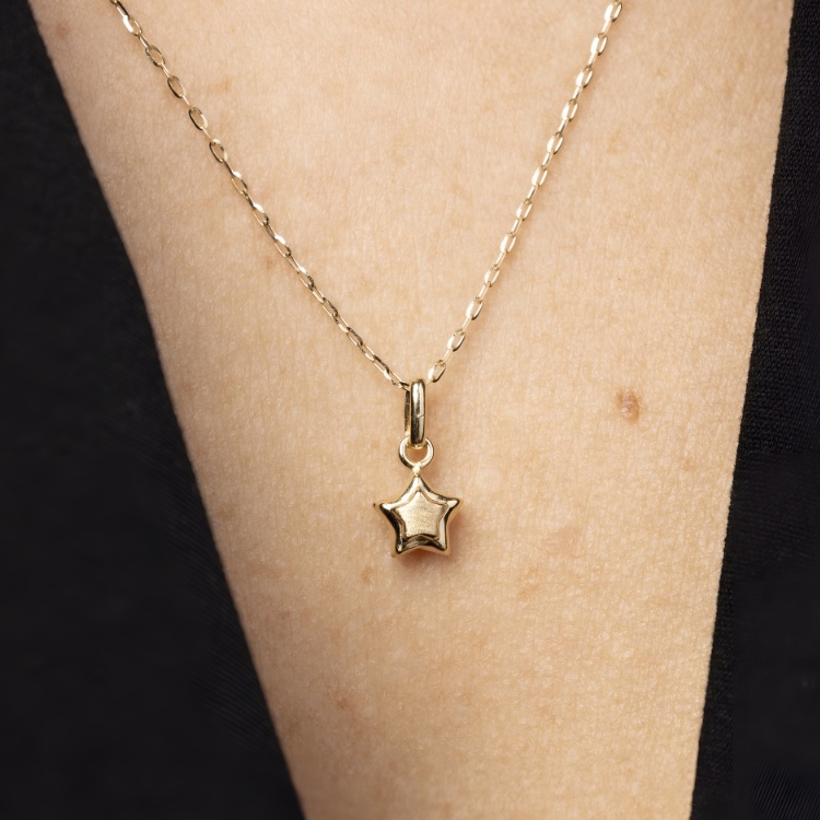 תליון "סטלה" המיניאטורי עם שרשרת בצורת כוכב בזהב 14 קראט מוסיף ברק וקלילות למראה שלך. העיצוב העדין שלו מדגיש אלגנטיות ומתאים לכל סגנון, ומוסיף נופך של תחכום.