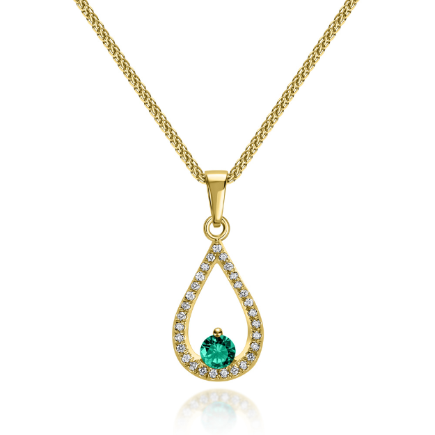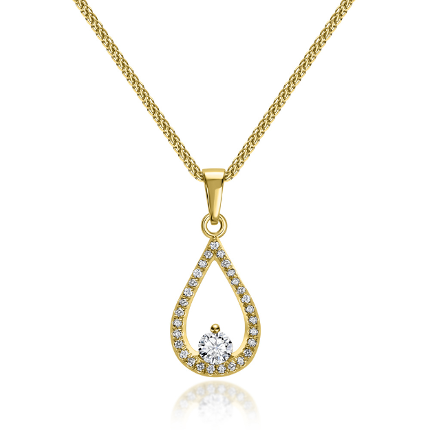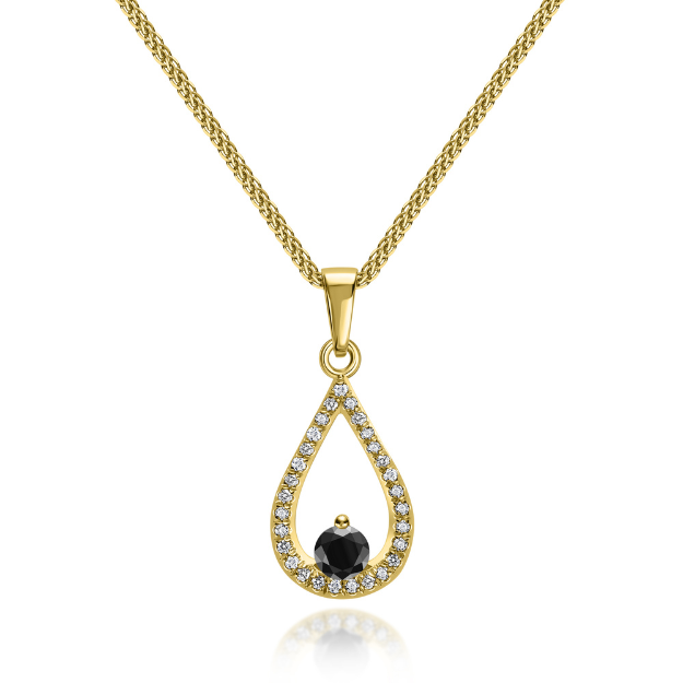 תליון "הרמוני" מזהב 14 קראט הוא פריט אלגנטי בעל עיצוב מתוחכם. תליון בצורת דמעה משובץ ביהלומים לבנים טבעיים מציע זוהר חינני ומדגיש את החומר היקר. האבן המרכזית לבחירתכם - יהלום, ספיר, אזמרגד, אודם או יהלום שחור - מוסיפה אופי ייחודי והופכת את התליון הזה למיוחד במינו.
